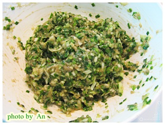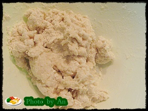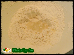 จากนั้นก็เทน้ำร้อนลงตรงหลุมก่อนสัก 1/3 ถ้วย ( เวลานวดหากนวดในห้องแอร์แป้งจะแข็งแห้งไว หากนวดในอุณภูมิห้อง หากใส่น้ำมากไปแป้งจะเหลวค่ะ ต้องกะๆ ให้ดี ) ใช้พายไม้ หรือ ตะเกียบคนให้เข้ากัน อย่าใช้มือนะขอบอก คนๆ จนแป้งเข้ากันพอทั่ว ให้น้ำจับตัวกับแป้งเป็นก้อนหยาบๆ
