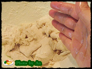 ต่อไปก็ถึงขั้นตอนการนวด ไม่รู้นอกสูตรมั้ย แต่ก่อนอัญจะนวดอัญจะเอาน้ำมันงา มาทามือก่อนนวด แป้งจะได้ไม่ติดมือ และ แป้งก็หอมน้ำมันงาด้วย นวดๆ ให้เข้ากันจนเนียนเลยค่ะ หากแป้งแห้งไปให้เติมน้ำอุ่นได้ทีละหน่อยๆ ค่ะ นวดๆ ไปประมาณ ห้านาที