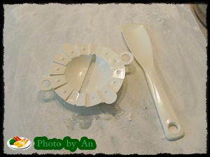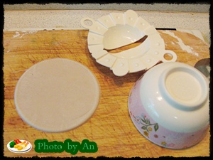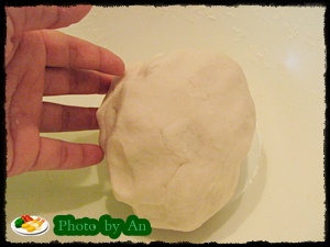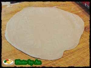 วางแป้งที่เราปั้นบนเขียง แล้วใช้ อืม..... เค้าเรียกอะไรหว่า ที่เค้าใช้รีดแป้งให้มันบางๆ มีด้ามจับสองมือ เวลาทำขนมปังอ่ะ แต่อัญไม่มีหรอก อัญใช้ขวดน้ำมันงา รีดเอา หุหุหุ