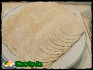 ระหว่างรีดก็หมั่นโรยแป้งมันให้ทั่วๆ เขียง ถ้าโรยไม่ทั่วเดี๋ยวมันจะติดเขียงเอา ( เวลารีดให้รีดบางๆ แต่อย่าบางมากเดี๋ยวตอนใส่ไส้ ตัวแผ่นเกี้ยวซ่าจะแตกได้ )