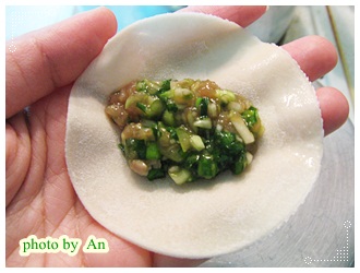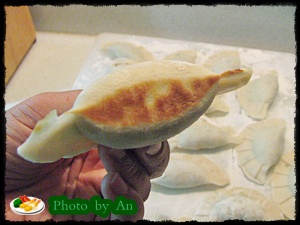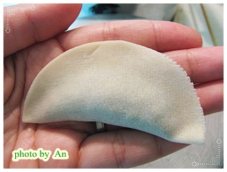 แป้งก็เสร็จแล้ว ไส้ก็เสร็จแล้ว นำมาห่อเลยค่ะ ใส่ไส้ตรงกลางแผ่น ทาน้ำเปล่าบางๆ ตรงด้านบนครึ่งนึง แล้วพับครึ่งกดแผ่นแป้งเบาๆ ให้ติดกัน